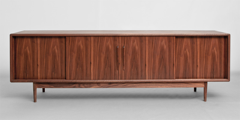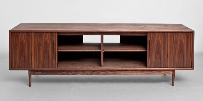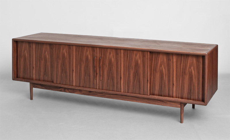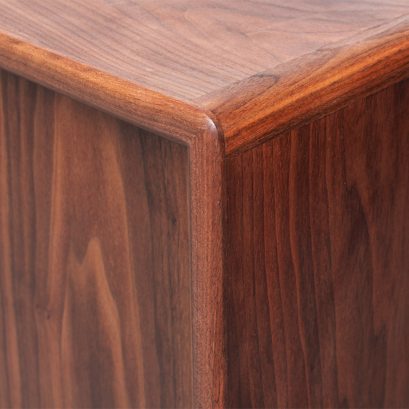 小口のタイコ面や角の丸み、引違戸の取手、テーパードラインの脚、後部の配線ガイドなど、直線的な安定したデザインの中に、丁寧に曲面を削り出すことで質感を高めました。引違戸は、収納するものに合わせ解放したままでも違和感が無い様に、納まりを工夫しています。
