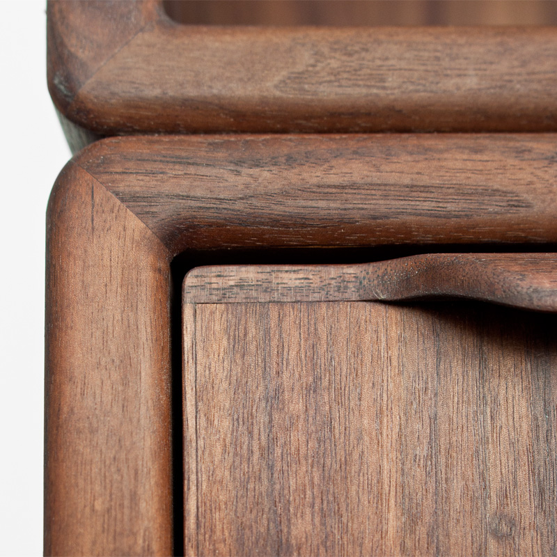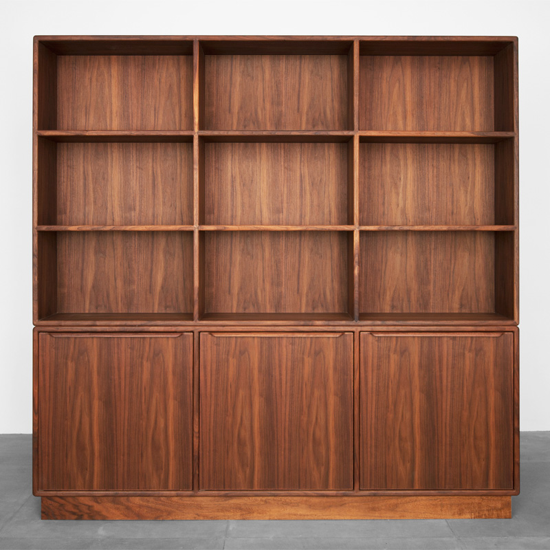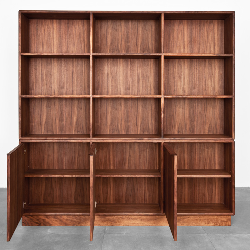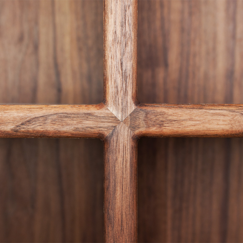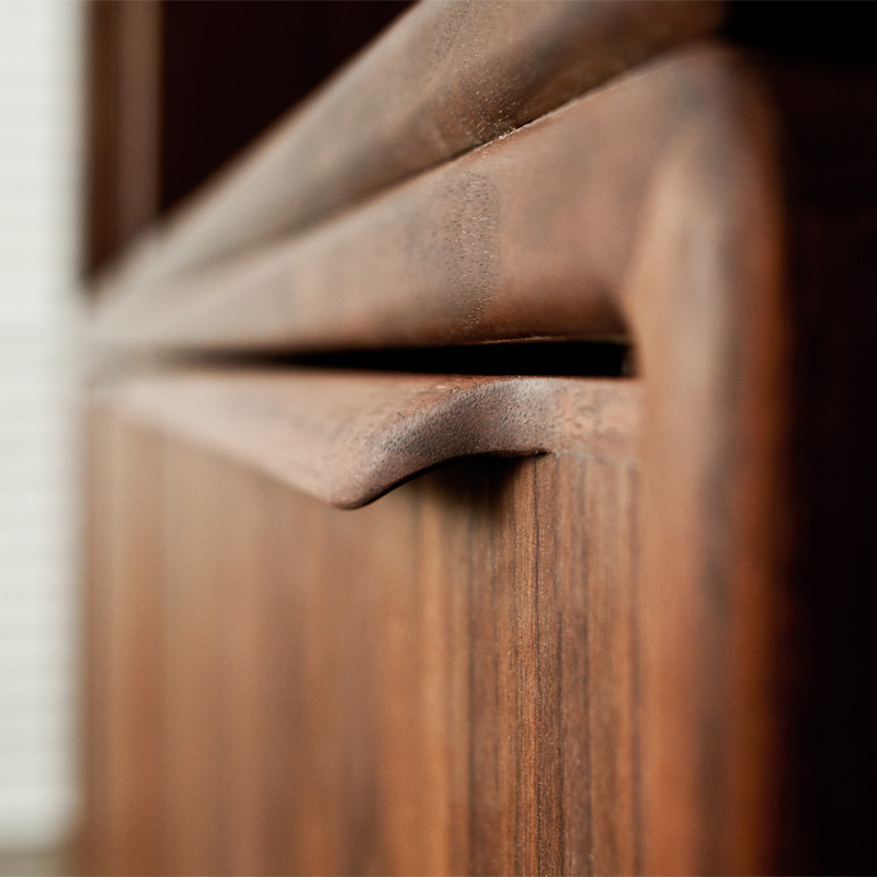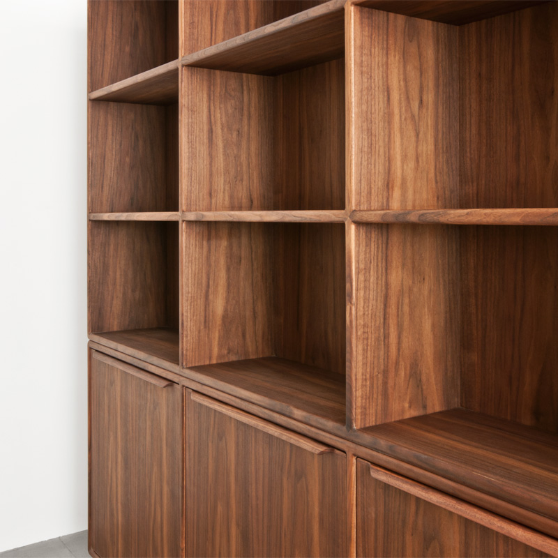 無垢材を用いて削り出した、上・下段それぞれの角面、小口のタイコ面、手掛かり良く滑らかな取手など、細部にまで意匠を凝らし、上質で木の豊かな表情を感じることが出来るディスプレイキャビネットです。サイズオーダー、上段棚板にLED照明の埋め込み、間仕切りとしても使用出来る様に背板の有無を選択、既存の壁面仕上に合わせての背板の仕上変更など、様々にカスタマイズ出来ます。
