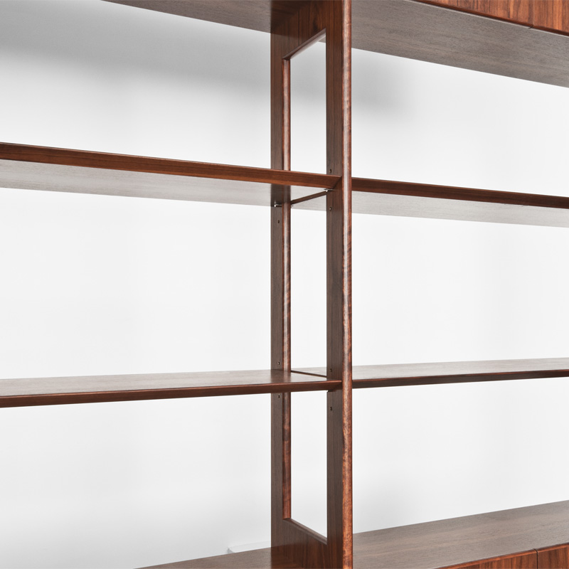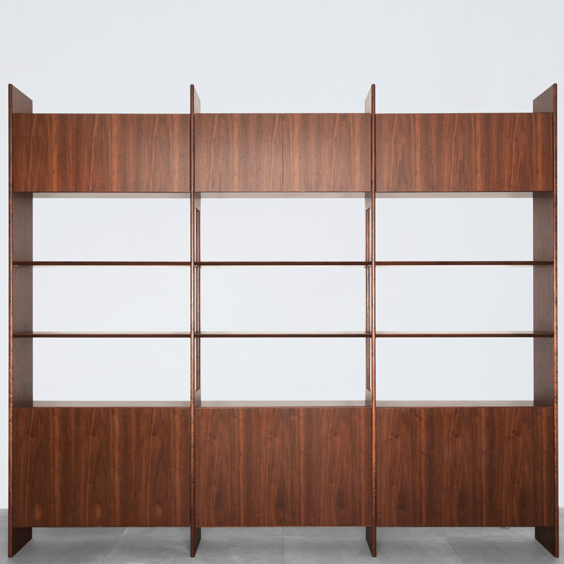 帆立・ボックス上下段(可動棚板各1枚)・可動棚板2枚を基本ユニットとして、自由な組合せが出来るシステムキャビネットです。設置場所に合わせてのサイズオーダー・ユニットの組合せ・開き戸又は引き戸・抽斗・ガラス棚板・背板・埋め込み照明など、多様なカスタマイズが出来ます。間仕切りとしても設置可能です。小口のタイコ面仕上げ、棚板前面のテーパーデザインなど、意匠にも拘りました。