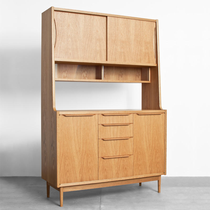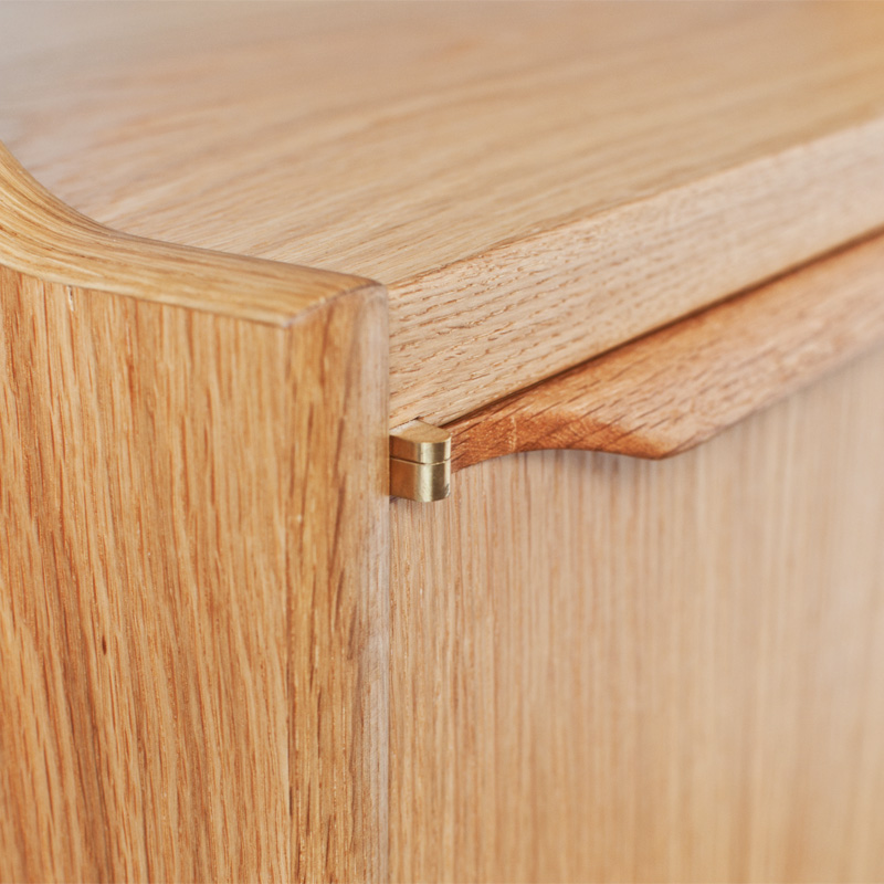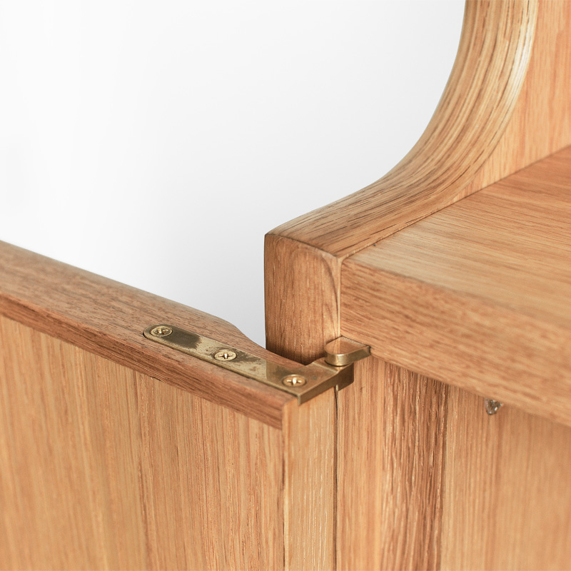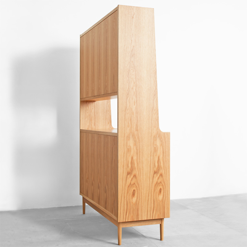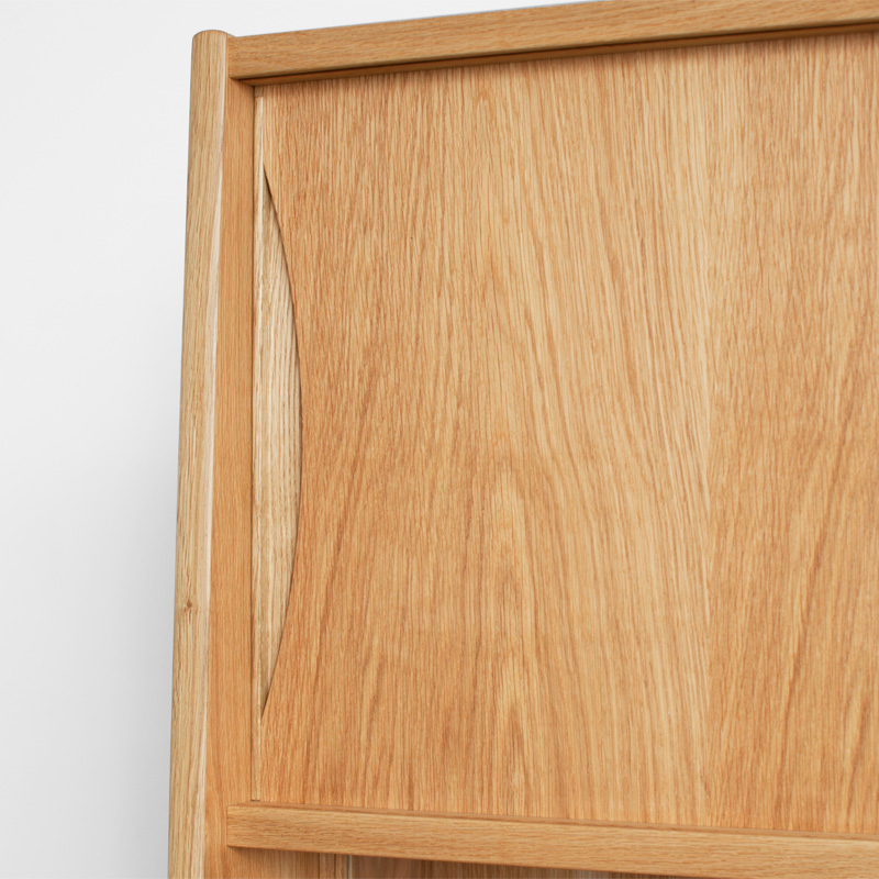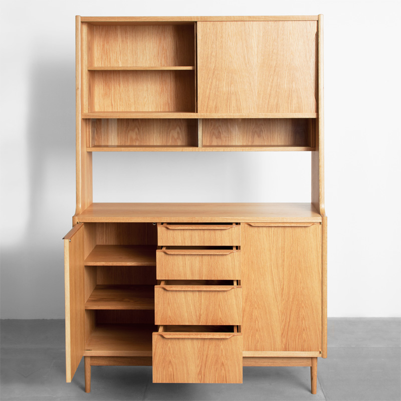 上段には木製とガラスの引違い戸、下段には開き戸とその中央に抽斗、上下段の間にはフリースペースと、高い整理・収納力を持たせました。開き戸には真鍮製の蝶番、開き戸・抽斗の取手は無垢材の削り出し、フレーム前面小口に曲げ木を施し、間仕切りとしても使用出来る背面化粧仕上げなど、細部の質感にも拘ったカップボードです。サイズオーダーやカスタマイズも可能です。
