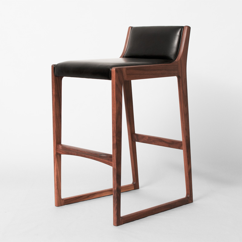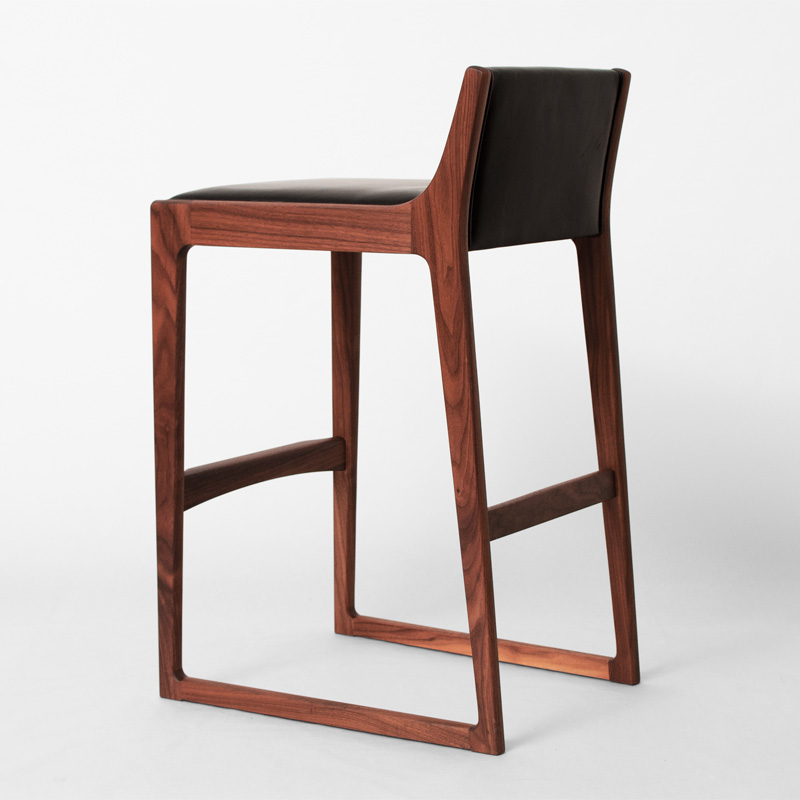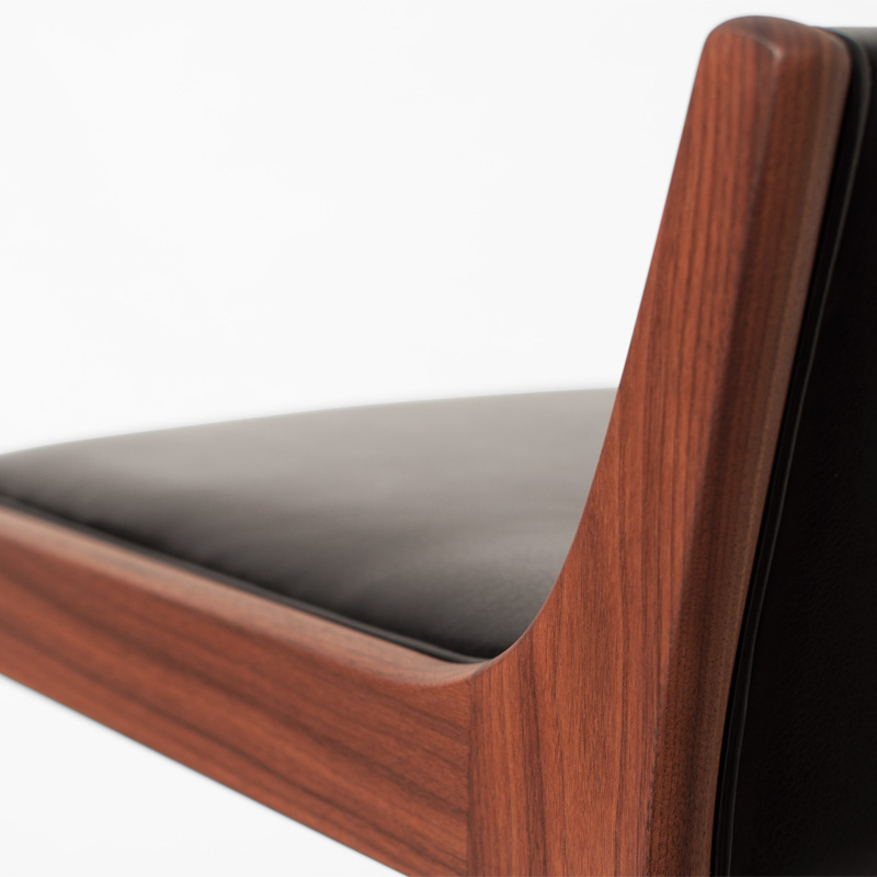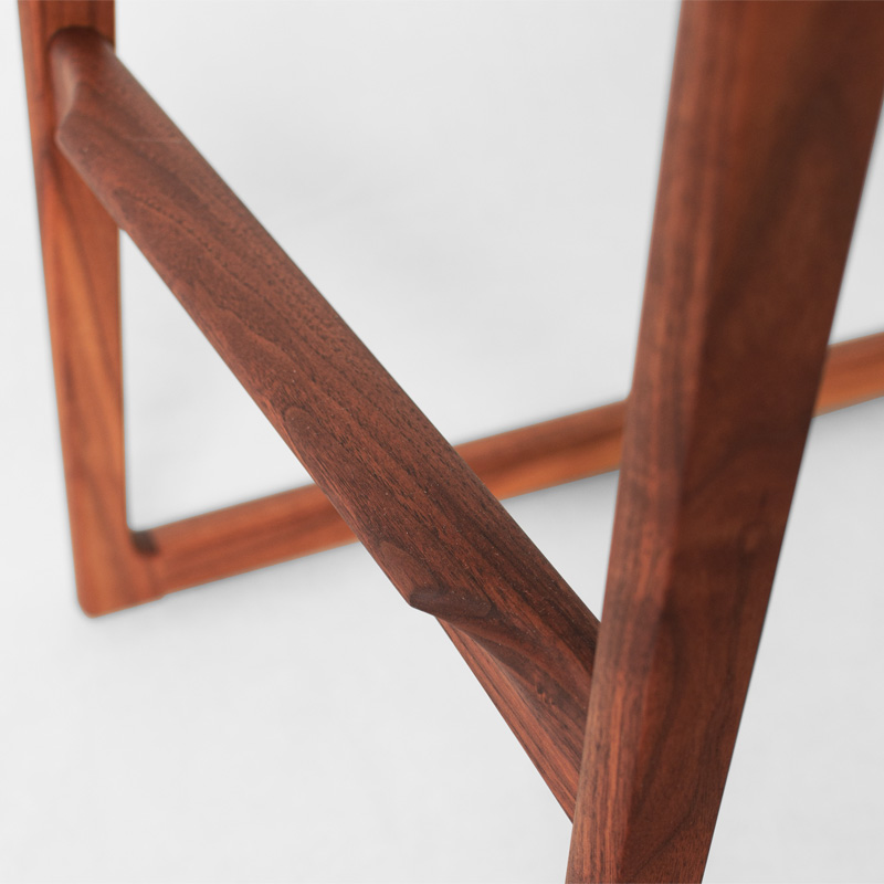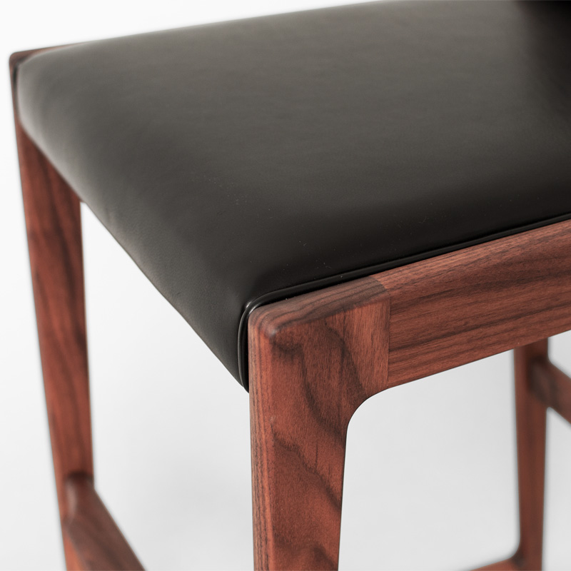 高い座面高でも背当てが体をしっかりとホールドし、もたれ掛かる荷重を後脚に角度をつけることで受け止め、収まり感のある安定した座り心地を生むハイスツールです。荷重の掛かる部位は材に厚みを持たせ接合強度を高め、貫の脚置きは巾のある材から削り出したものなど、機能に優れた美しい意匠の数々を用い巧みに組み上げています。
