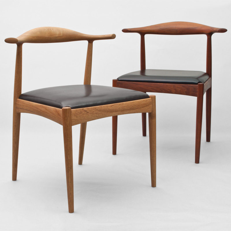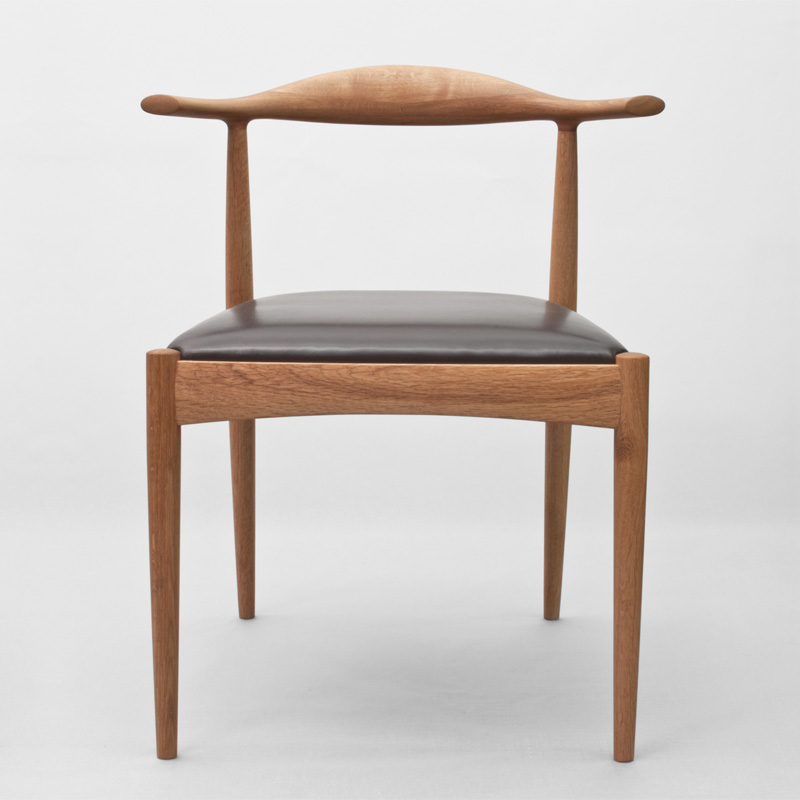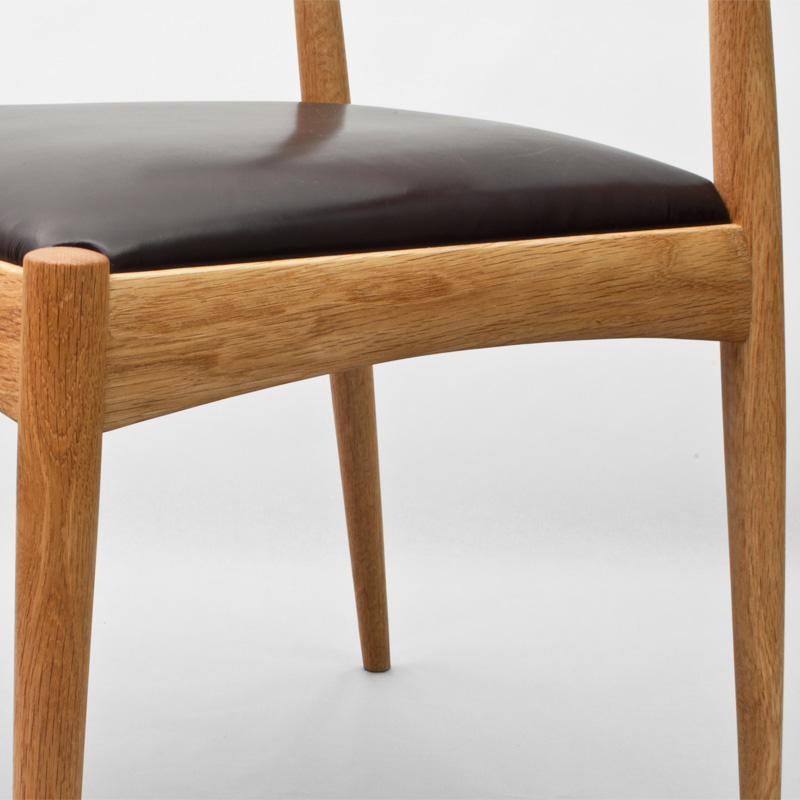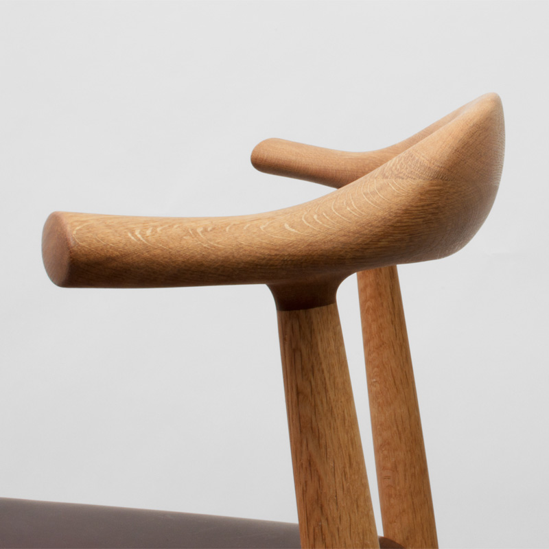 肘掛けと背あたりを複雑な曲面を滑らかに削り出し一体化させ、座面を広くとり、後脚に角度を付け、ゆったりともたれかかることも、背筋を伸ばして深く座ることも出来る自由度を高めました。座枠の接合部は厚く、中程を弓状に削り込むことで、強度のあるしっかりとした座り心地を支え、手掛かりを良くするなど、椅子としての一つ一つの機能を丁寧に纏め上げました。背の低いフォルムは、部屋を広く感じさせる視覚効果も生み出します。