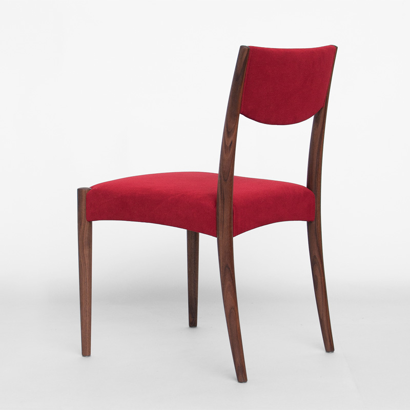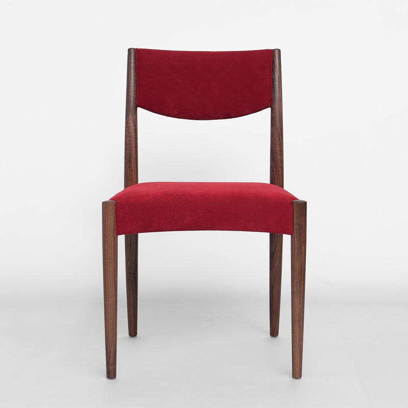 椅子としてのミニマムなスタイルの中に拘りを込めました。背板の中心部分を巾広にし体幹を支え、座面はしっかりとしたクッション性を持たせて、理想的な着座姿勢に導きます。座面下の曲面は、手持ちしやすくし、脚との接合部分を幅広にして強度を高めるためのもの。一本の無垢材から削り出した脚は、強度ある安定した座り心地を生み、木の豊かな表情を見出すことが出来ます。