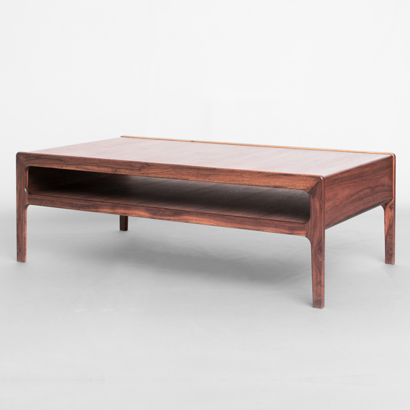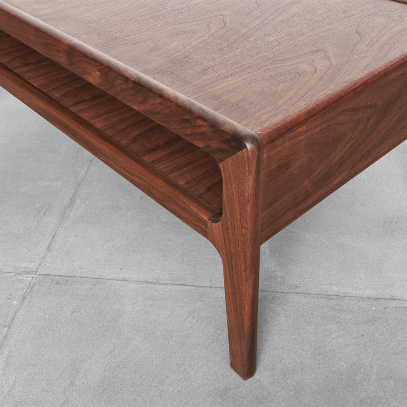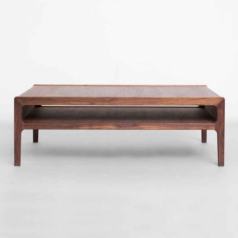 "留め"や"持ち出し"など印象的な木組みを用いた框状の脚、"タイコ面"に仕上げた各小口、天板や棚板の下面まで表面と同材で仕上げるなど、シンプルでありながら深みある作りの良さを感じられるコーヒーテーブルです。