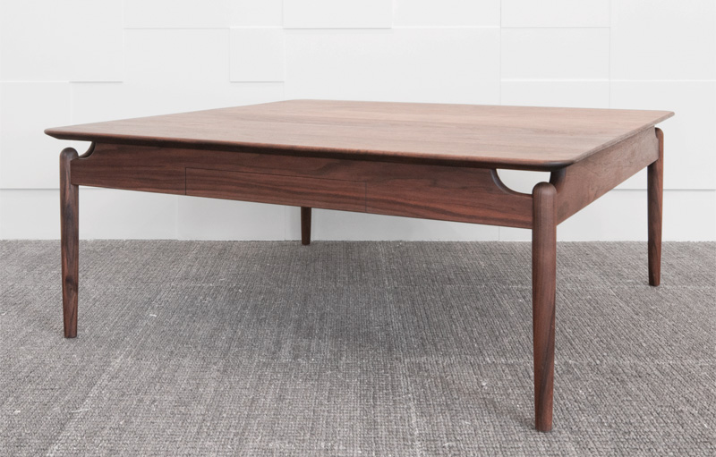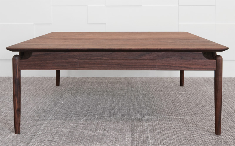 天板と脚を幕板で繋ぐ構造が印象的な、品のある佇まいのコーヒーテーブル。幕板や脚にも滑らかな曲面で丁寧に意匠を施すことで、木の表情を魅き出し、より質感を高めました。抽斗の有無もお選びいただけます。