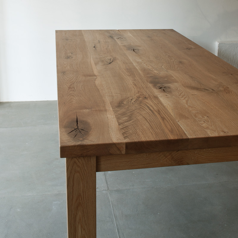希少な北海道産の楢の中でも、さらに特別な、木材として一般に流通されていない規格外の木をそのまま使い仕上げたテーブルです。天板もより厚みをとり、それを支える脚部は一本の丸太から削り出され、存在感を高めます。他に類を見ない豊かな木の表情と質感を、シンプルな形で際立たせました。